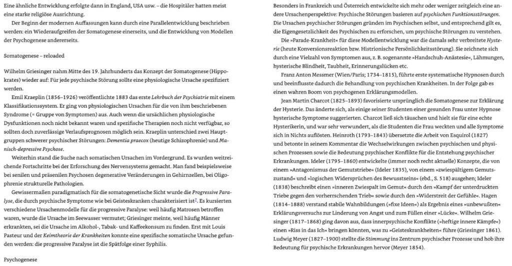 Der Beginn der modernen Auffassungen kann durch eine Parallelentwicklung beschrieben werden: ein Wiederaufgreifen der Somatogenese einerseits, und die Entwicklung von Modellen der Psychogenese andererseits.