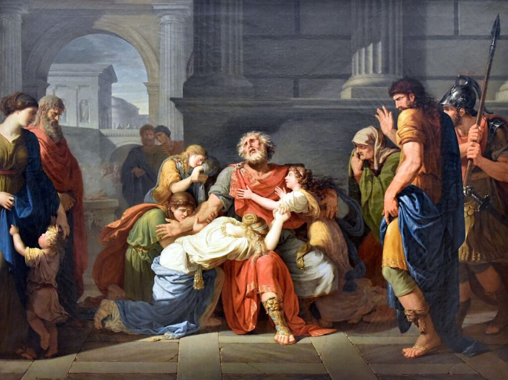 (1) Der blinde Ödipus, der seine Kinder den Göttern anvertraut (1784) von Bénigne Gagneraux. In seiner Poetik verwendet Aristoteles die Tragödie Ödipus Tyrannos von Sophokles als Beispiel dafür, wie die perfekte Tragödie aufgebaut sein sollte, mit einem im Allgemeinen guten Protagonisten, der zu Beginn des Stücks wohlhabend ist, aber durch eine Hamartie (Fehler) alles verliert.
