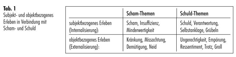 In einem groben Ordnungsversuch können die im Umfeld von Scham und Schuld auftretenden Erlebensformen in subjekt- und objektbezogenes Erleben und den damit verbundenen Bewältigungsstrategien unterschieden werden (Tab. 1). Subjektbezogenes Erleben meint hier, dass die Quelle des Scham-oder Schuldgefühls beim Subjekt angesiedelt ist: