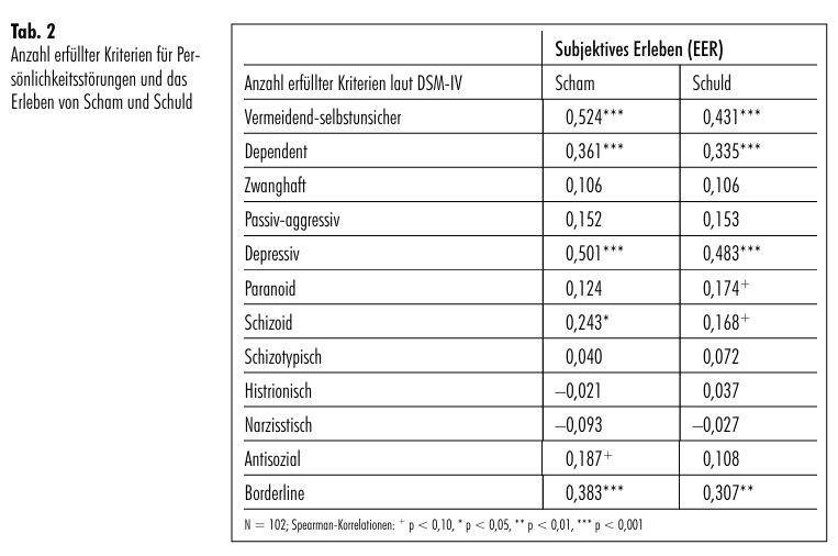 6 Ein signifikanter Zusammenhang findet sich auch für Schamerleben und Schizoide Persönlichkeitsstörung, zudem einige tendenziell signifikante Korrelationen. Kritisch anzumerken ist, dass für einzelne Persönlichkeitsstörungen nur sehr selten Kriterien erfüllt wurden (für Antisoziale, Narzisstische, Histrionische, Paranoide, Schizoide sowie Schizotypische Persönlichkeitsstörung wurde jeweils bei über der Hälfte der Versuchspersonen kein DSM-IV-Kriterium erfüllt).